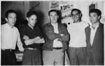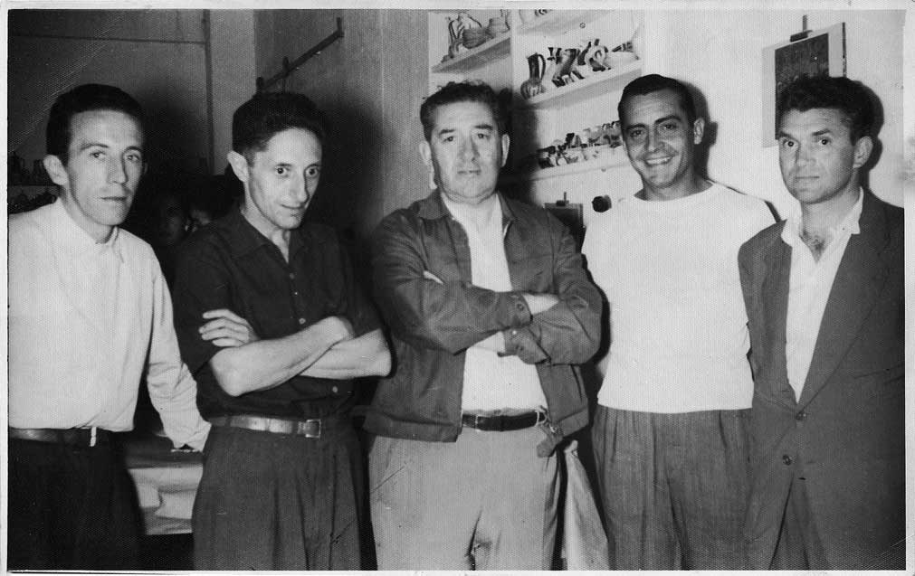 Con sus amigos de Mataderos, en la inauguración de una muestra. De izquierda a derecha: Oscar Mutis, Geno, Rigaud, Secundino Vilaboa, Víctor Laudari, Humberto Civilo, José Ruiz y Gabriel, hijo de Geno.